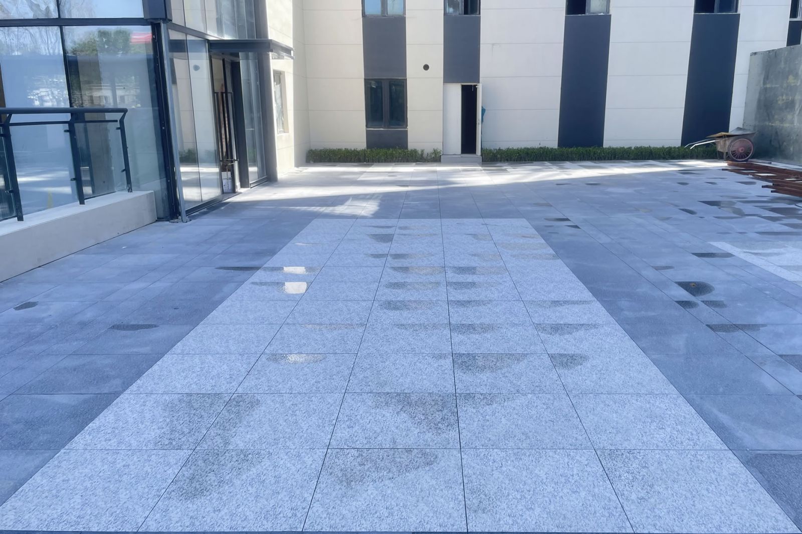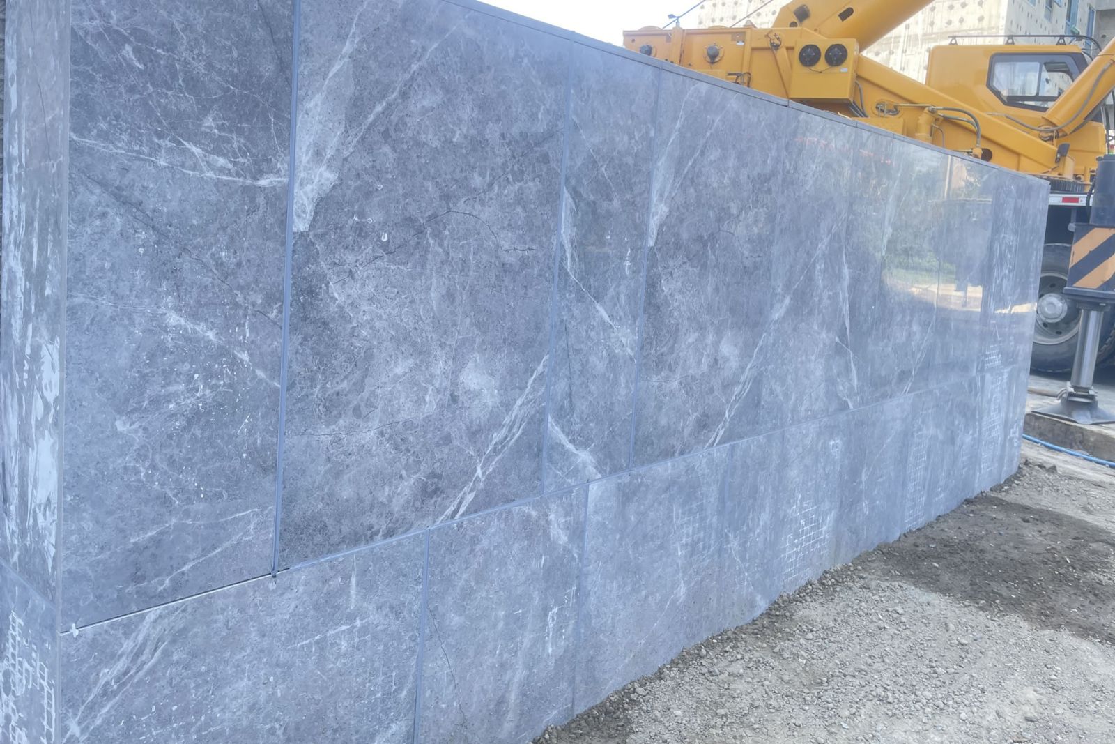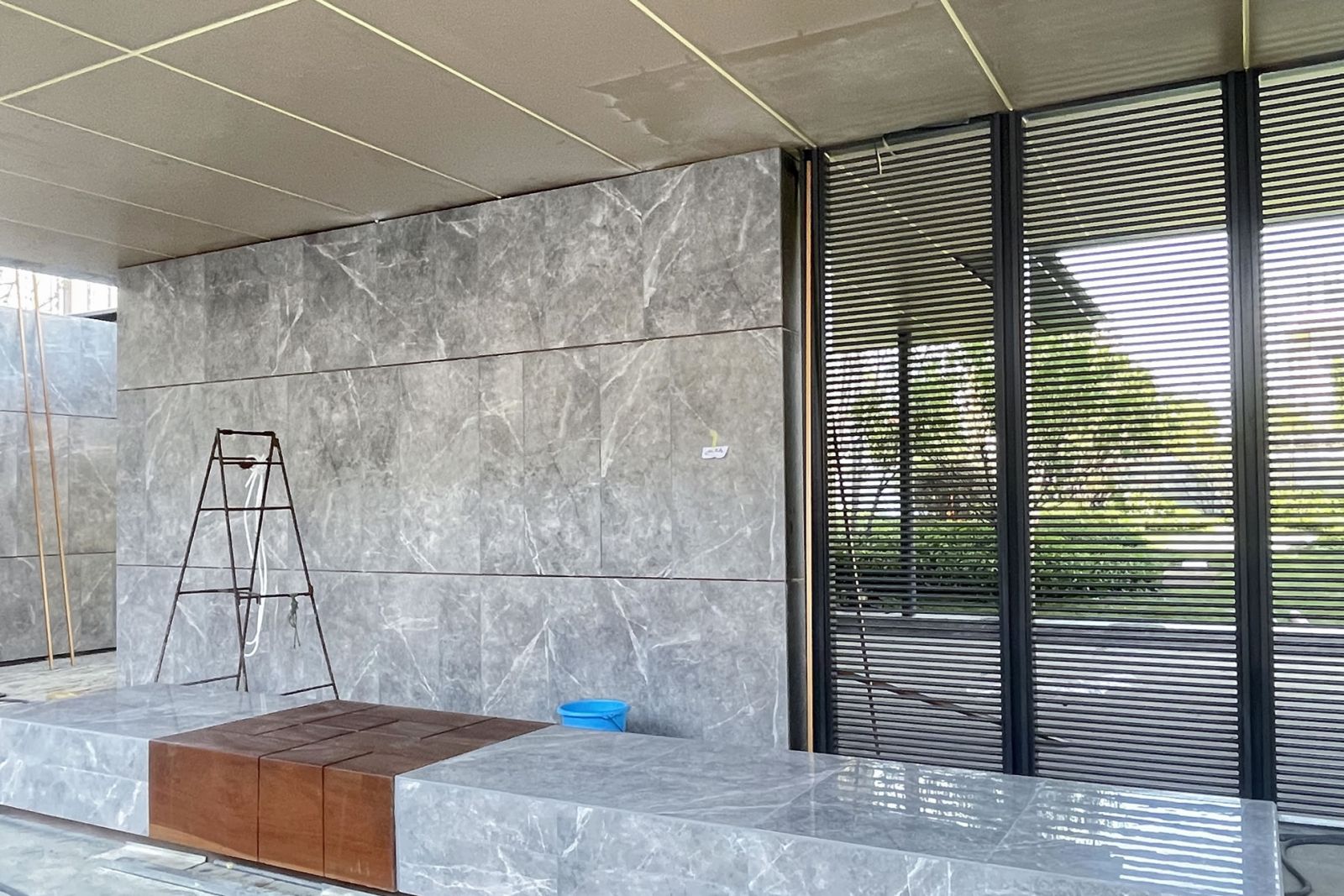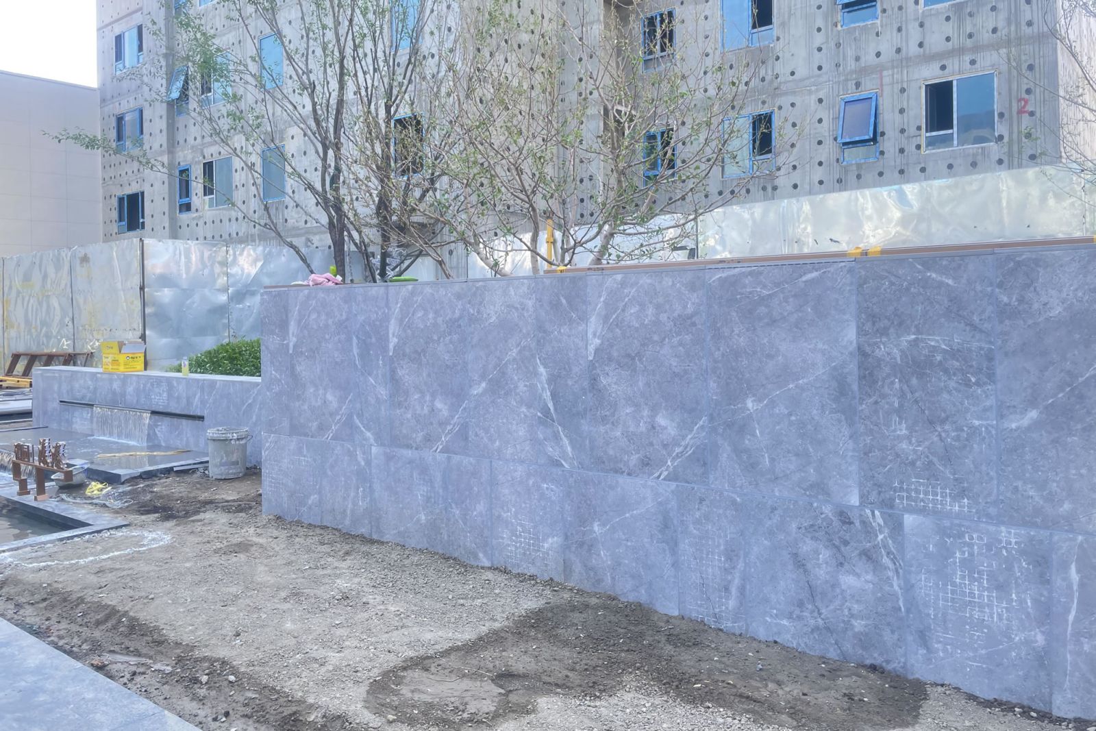 協進厚板工程案例——烏魯木齊萬科天山府 該項目是一座綜合性住宅小區,其園林設計采用了多種顏色的協進厚板,呈現出豐富多彩的景觀效果。 其中,地面使用了浪花白和夜里雪、芝麻灰系列混和鋪貼,此外,在景墻的設計中,維納多米黃和愛馬仕灰色的景墻磚也被巧妙地應用,使整個建筑物外觀更加美麗。
