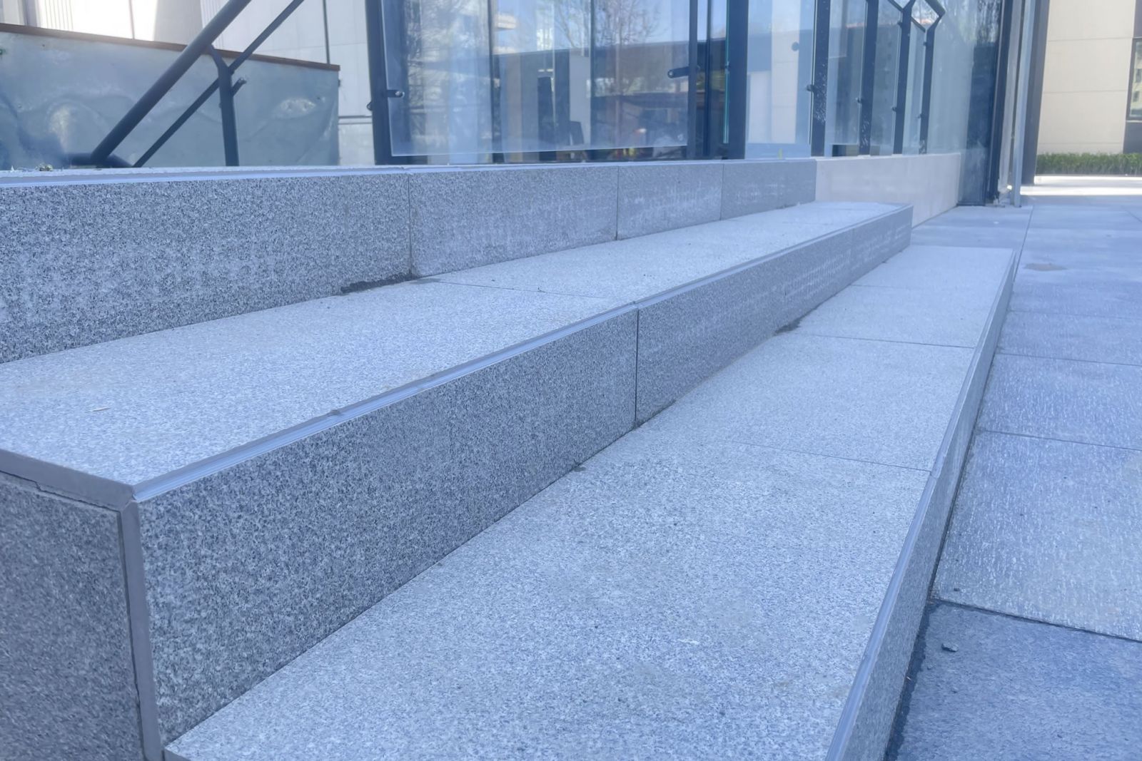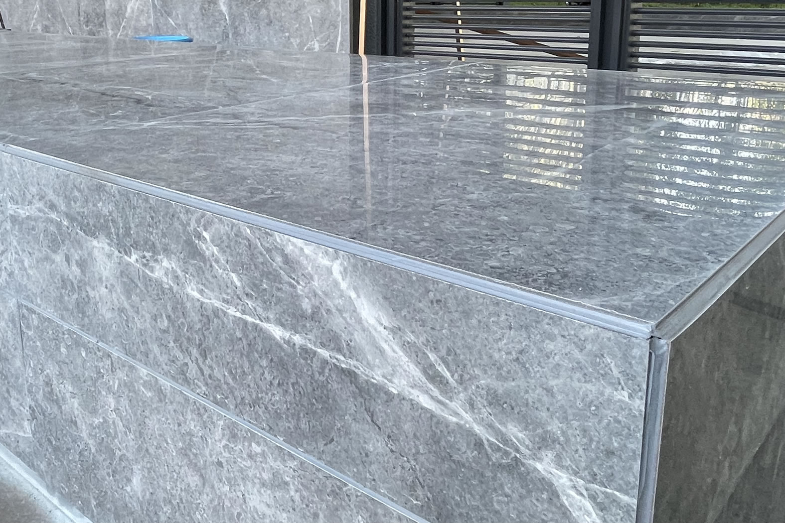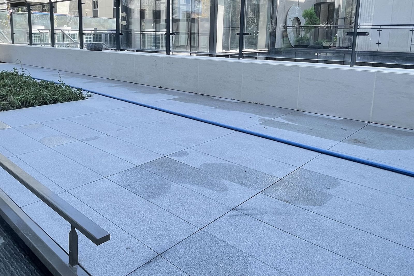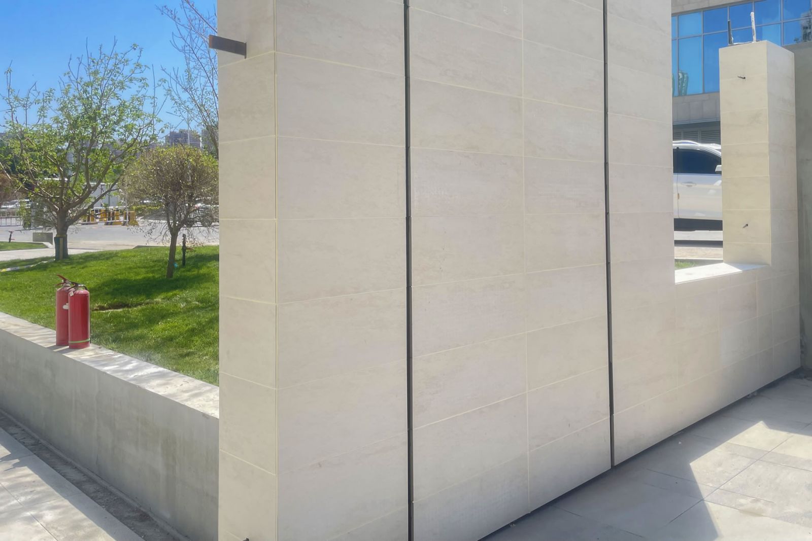 協進厚板工程案例——烏魯木齊萬科天山府 該項目是一座綜合性住宅小區,其園林設計采用了多種顏色的協進厚板,呈現出豐富多彩的景觀效果。 其中,地面使用了浪花白和夜里雪、芝麻灰系列混和鋪貼,此外,在景墻的設計中,維納多米黃和愛馬仕灰色的景墻磚也被巧妙地應用,使整個建筑物外觀更加美麗。