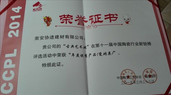 熱烈祝賀協進陶瓷古典藝術磚在號稱“中國陶瓷行業奧斯卡”評選活動中榮獲年度優秀產品獎。