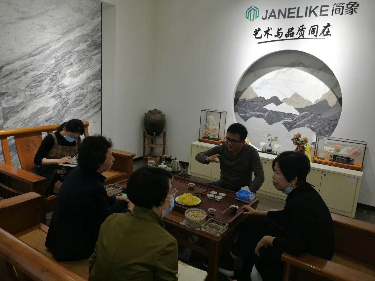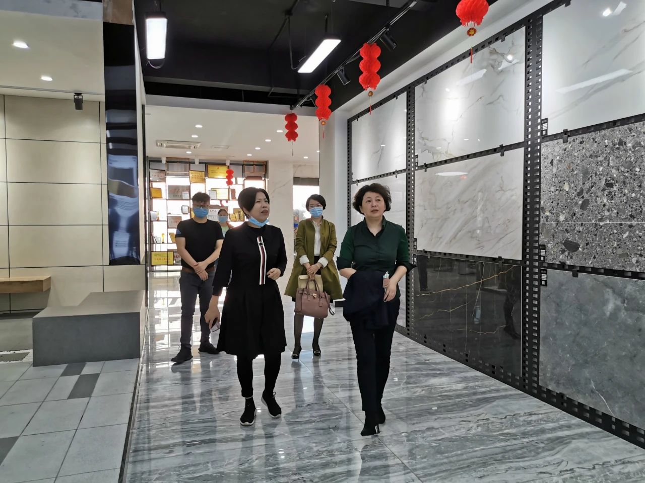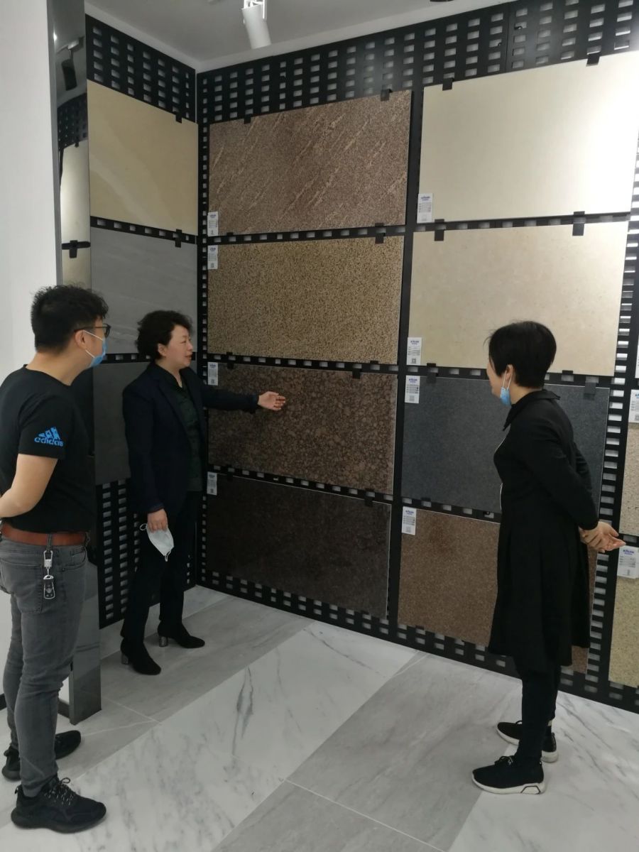 曾檢察長(zhǎng)一行在楊寶貴副董事長(zhǎng)的介紹下饒有興趣地參觀了產(chǎn)品展廳,對(duì)協(xié)進(jìn)研發(fā)生產(chǎn)的一系列大規(guī)格薄板、大板、陶瓷薄板復(fù)合保溫一體板、巖板等綠色節(jié)能新產(chǎn)品,以及3D噴墨等工藝技術(shù)在瓷磚產(chǎn)品上的運(yùn)用贊嘆不已,不時(shí)詢問諸多產(chǎn)品在整體家裝領(lǐng)域的鋪貼使用效果。