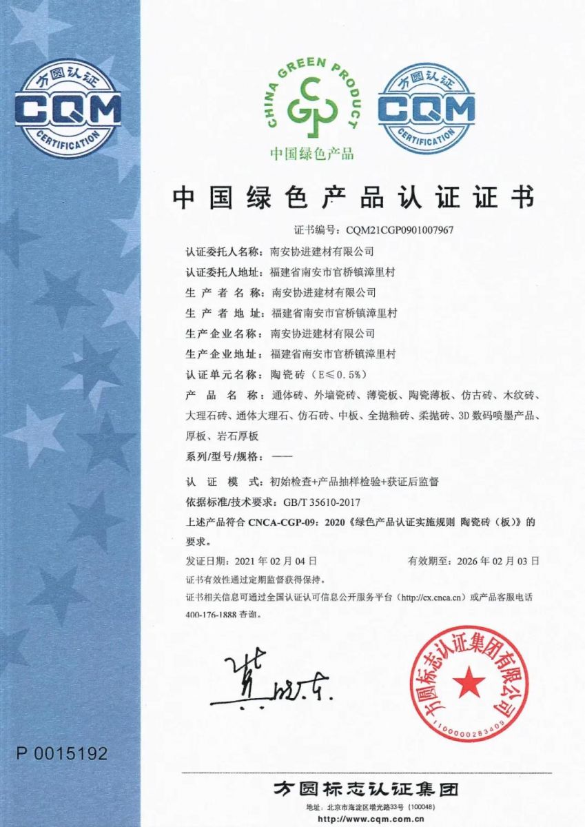憑借持續(xù)踐行“綠色、節(jié)能、環(huán)保”的發(fā)展理念通過“中國綠色產(chǎn)品”認(rèn)證。是對2012年獲評“全國節(jié)能先進(jìn)集體”、2017年通過“三星級綠色建材評價標(biāo)識”認(rèn)證后的鼓勵和再次肯定。協(xié)進(jìn)陶瓷將繼續(xù)與社會各界一同攜手構(gòu)建低碳環(huán)保建筑體系,為實(shí)現(xiàn)企業(yè)與社會的可持續(xù)發(fā)展繼續(xù)努力。