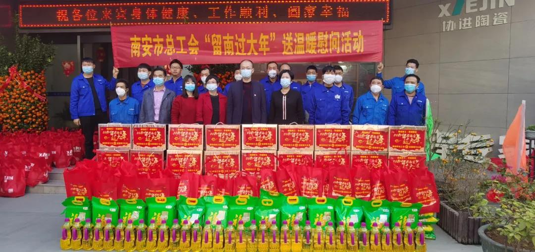 臘月時節(jié),暖風(fēng)徐徐。南安市紀(jì)委監(jiān)委駐市總工會機(jī)關(guān)紀(jì)檢監(jiān)察組副組長姚添丁、南安市總工會組織部負(fù)責(zé)人陳雅婷帶隊(duì),在官橋鎮(zhèn)黨委二級主任科員、鎮(zhèn)總工會主席李彩芳,官橋鎮(zhèn)人力資源和社會保障所所長、鎮(zhèn)總工會副主席蔡偉忠等人的陪同下,蒞臨協(xié)進(jìn)公司走訪慰問留南過年的外來員工,為員工們送來了黨委、政府、工會娘家人的新春關(guān)懷和溫暖禮包。
