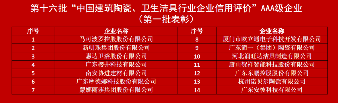 近日,中國(guó)建筑衛(wèi)生陶瓷協(xié)會(huì)2023年年會(huì)在南昌舉行。會(huì)上,為建陶行業(yè)第十六批誠(chéng)信企業(yè)授牌,南安協(xié)進(jìn)建材有限公司連續(xù)第六次獲評(píng)為中國(guó)建筑陶瓷與衛(wèi)生潔具行業(yè)AAA級(jí)信用企業(yè)。