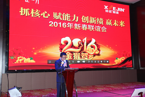 公司總經(jīng)理王少華在致辭中表示,2016年是關(guān)系企業(yè)生存的關(guān)鍵一年,希望全體協(xié)進人和經(jīng)銷商能夠更進一步發(fā)揚“攜手創(chuàng)輝煌,創(chuàng)新求卓越”的協(xié)進精神,精誠團結(jié)、齊心協(xié)力,確保企業(yè)渡過這一艱難時期。在這期間,一是牢牢抓住產(chǎn)品創(chuàng)新這個核心。通過加快對新產(chǎn)品的研發(fā)投入,促進產(chǎn)品升級升值。比如公司最新研發(fā)的漢文化磚系列和小規(guī)格仿古磚系列新產(chǎn)品,就是為企業(yè)穩(wěn)健發(fā)展創(chuàng)造新的增長動力。二是賦予能力。通過持續(xù)的學(xué)習(xí)培訓(xùn),進一步提高全體人員的經(jīng)營管理能力、勞動技能水平和營銷業(yè)務(wù)技能。三是創(chuàng)新營銷模式。借用互聯(lián)網(wǎng)思維,開創(chuàng)新一代的營銷模式。2016年公司對營銷體制進行改革,讓更多有能力的員工在企業(yè)平臺上打拼一番新的事業(yè)。四是精細化生產(chǎn)管理。通過流程再造,有效控制成本,同時提高產(chǎn)品質(zhì)量。